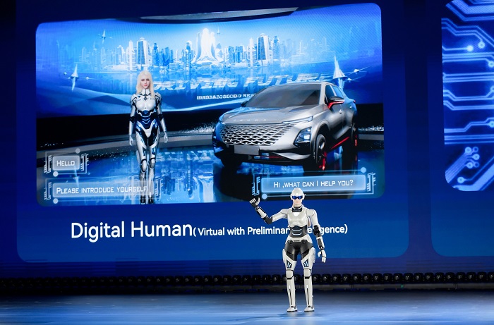 图为奇瑞墨甲机器人“墨茵”登台演讲
